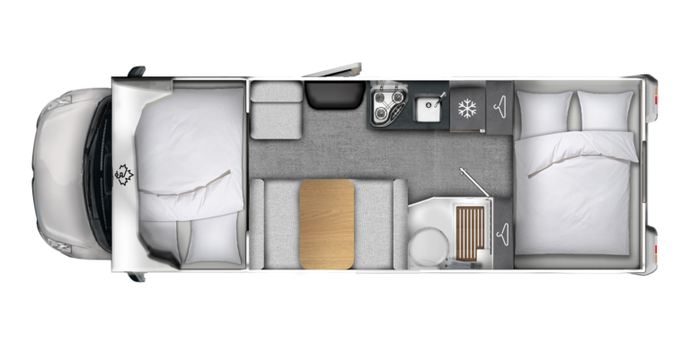 Der Alkoven A 720 ist das größte Modell seiner Klasse und bietet mit zwei großzügigen Doppelbetten – eines im Alkoven über der Fahrerkabine und eines im Heck – reichlich Platz für die ganze Reisecrew. Ob Familie, Freunde oder Paare mit hohem Komfortanspruch: Hier findet jeder seinen Schlafbereich. Der offene Wohnraum mit heller Einrichtung, voll ausgestatteter Küche und praktischem Bad sorgt für entspannte Aufenthalte unterwegs. Für zusätzlichen Schlafplatz lässt sich der A 720 mit einem optionalen Dinettenbett erweitern. Dank Renault-Master-Chassis, robustem Voll-GFK-Aufbau und moderner Isolierung sind Sie zu jeder Jahreszeit komfortabel und sicher unterwegs.