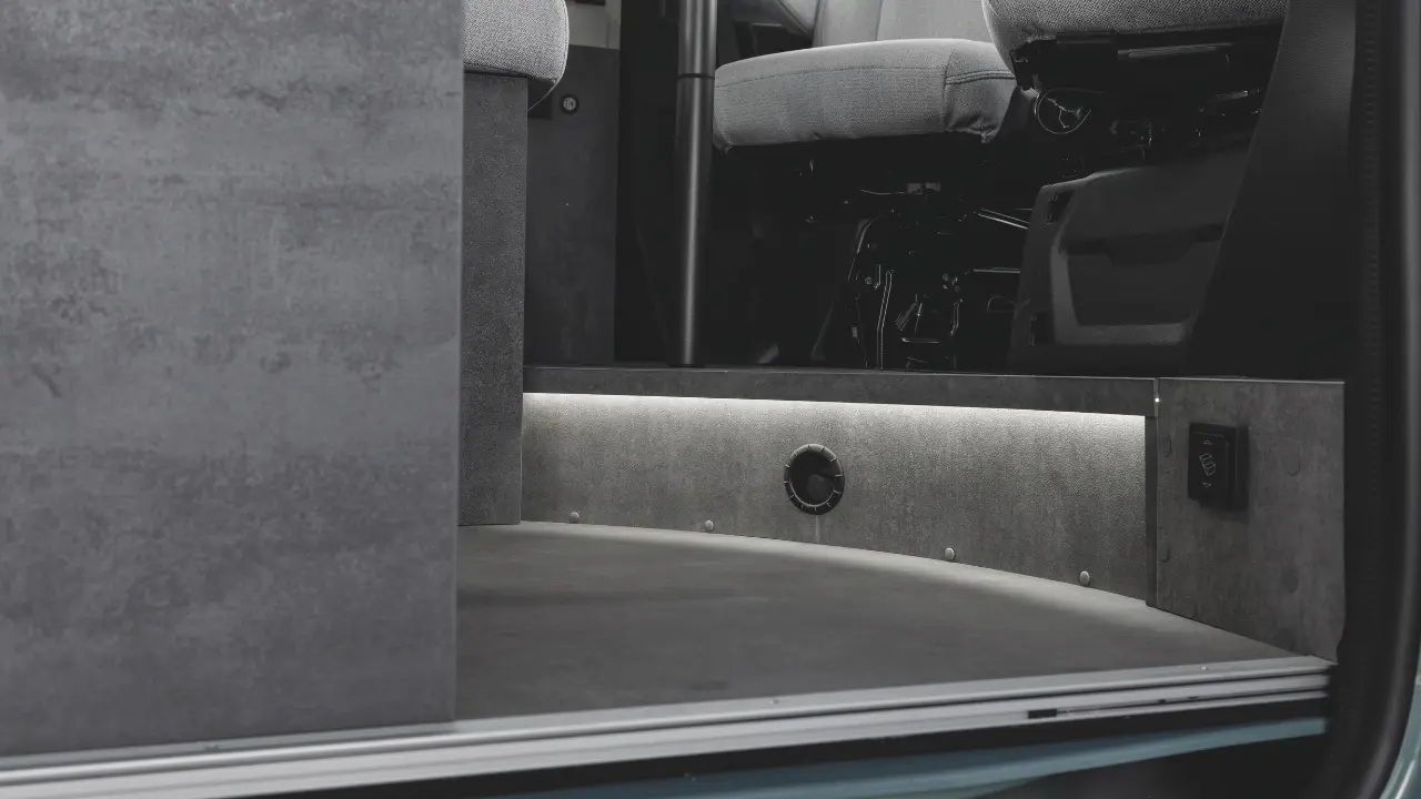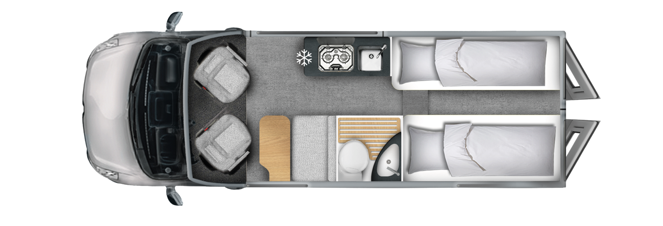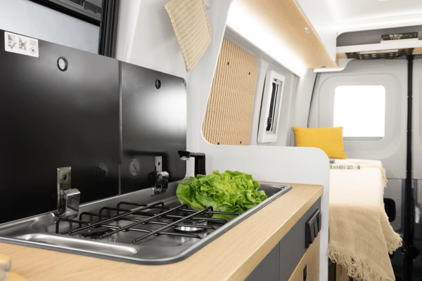 Die funktionale Küche mit 2-Flammkocher, Spüle und Kühlschrank ermöglicht frische Mahlzeiten unterwegs, während das integrierte Bad mit Dusche und WC volle Unabhängigkeit schenkt. Wer zusätzlichen Schlafraum benötigt, kann den Campervan mit einem optionalen Dinettenbett erweitern.