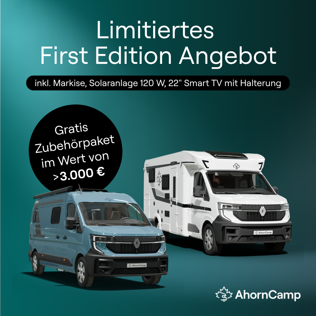 Beim Kauf eines der neuen Ahorn Camp Modelle in der limitierten First Edition erhalten Sie die Sonderausstattung im Wert von über 3.000 Euro geschenkt: