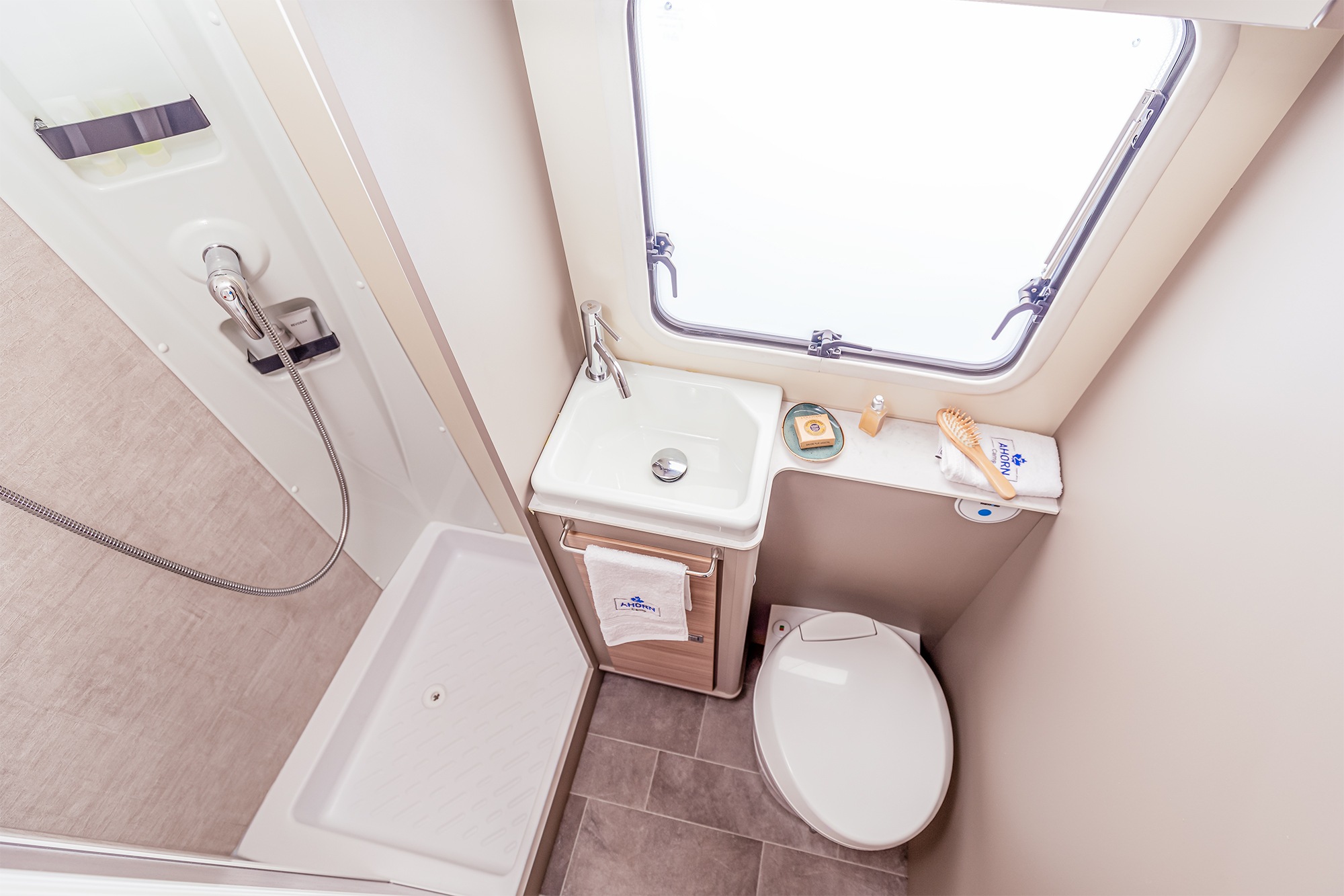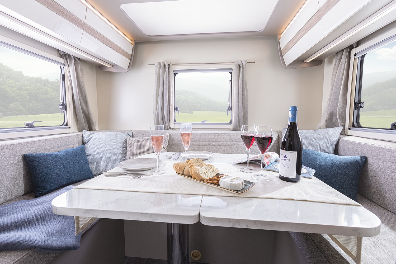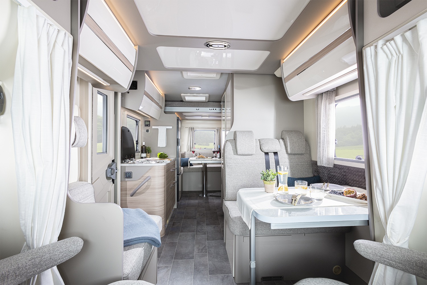 With the round seating group in the rear of the Canada TU, there are no limits to sociable camping evenings. The dining table with its elegant marble look can be folded out. In addition to the dinette in the front area, the TU offers cozy seating in the inviting rear lounge, for a total of 10 seats. The comfortable and wide upholstery offers pleasant seating comfort. In the evening, the electrically height-adjustable fold-down bed above the rear lounge serves as a cozy double bed. An additional double pull-down bed can be ordered as an option above the front dinette.
