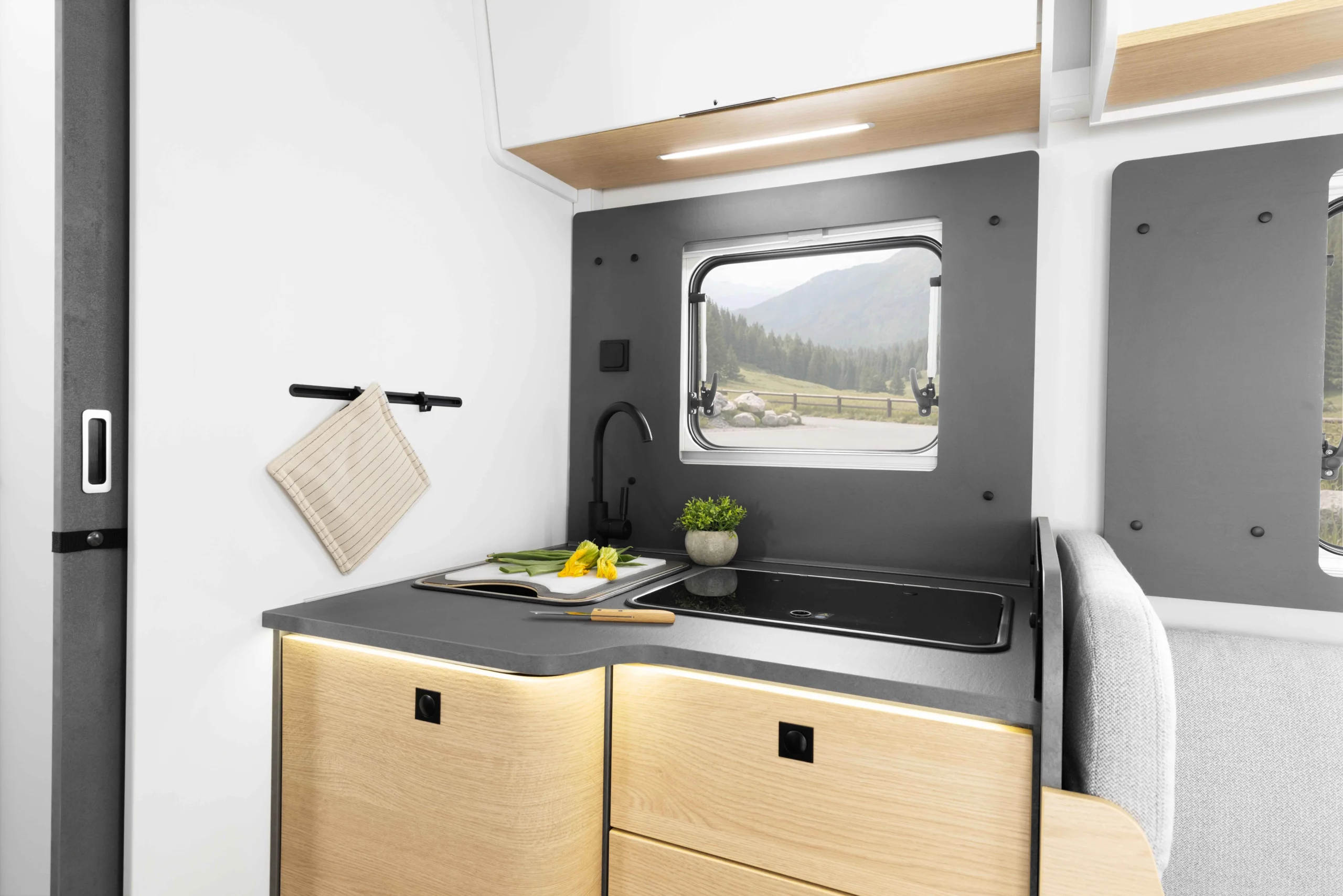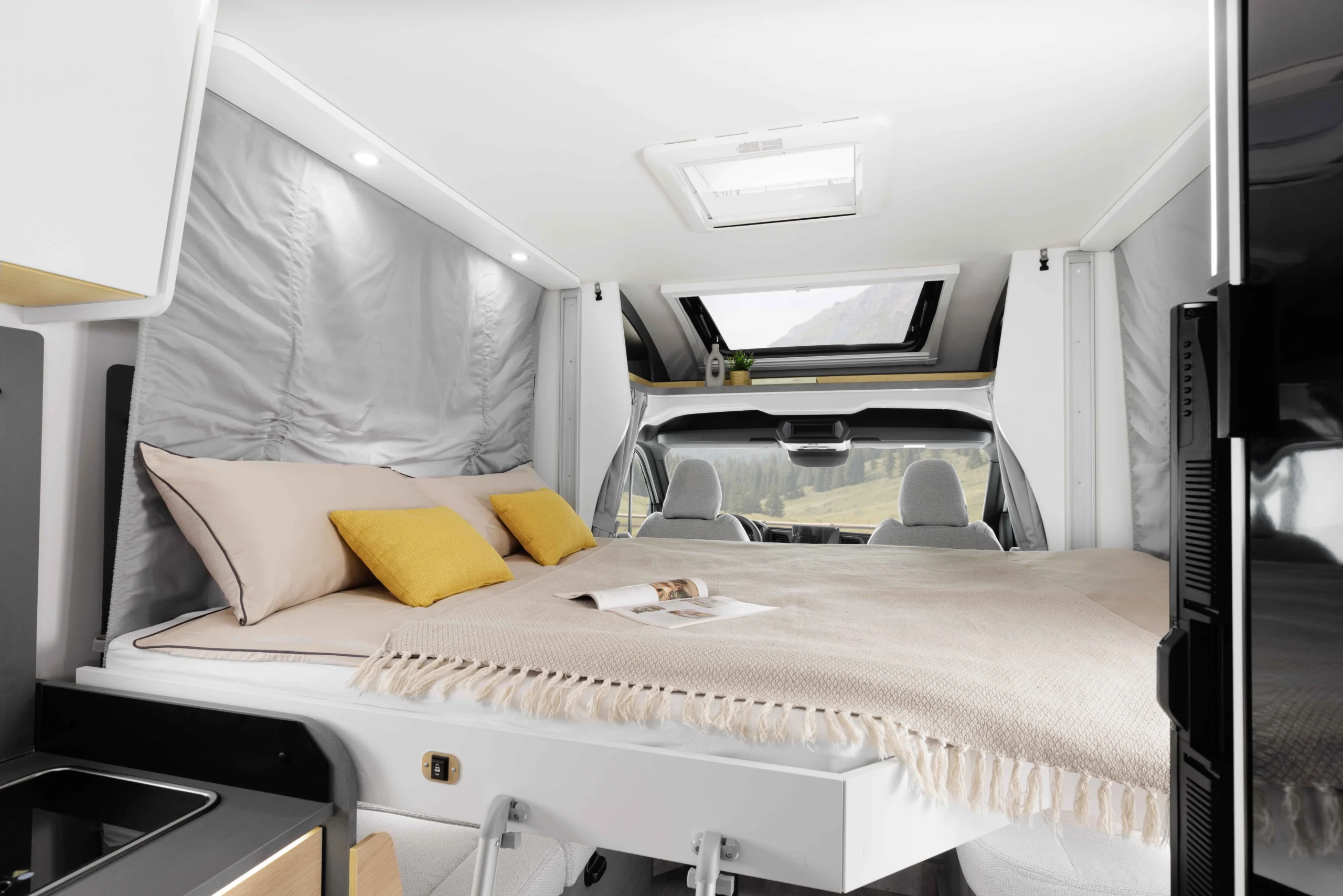 Dès que l'on pénètre dans le véhicule, l'espace de vie ouvert et spacieux attire le regard : un design moderne, des matériaux chaleureux et un espace étonnamment grand.